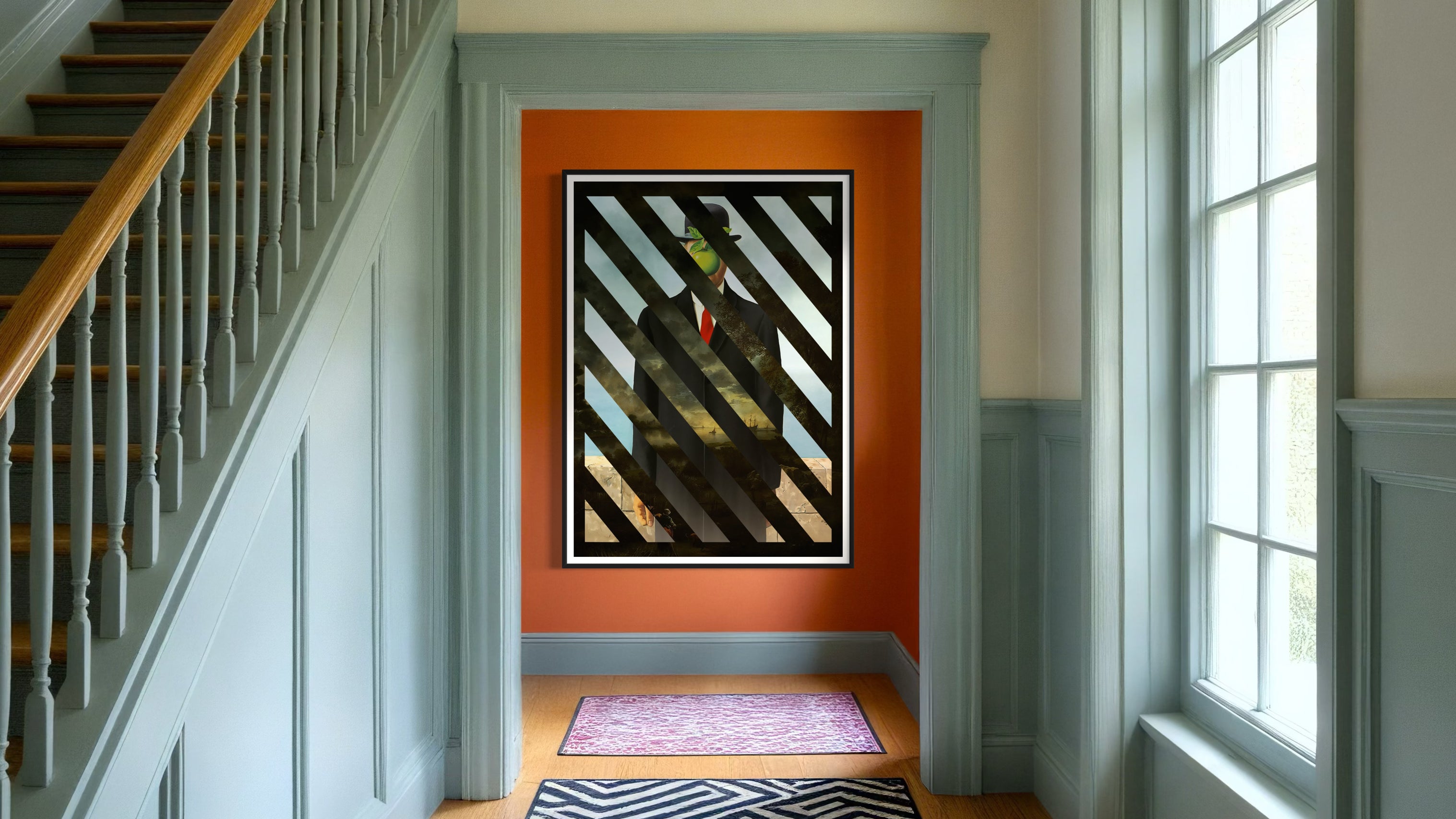 A figure out of time, The Displaced Man fractures the familiar surrealism of René Magritte’s The Son of Man and reassembles it within a world not its own. The faceless, bowler-hatted silhouette remains, but beneath its surface, a vast romantic seascape emerges—reminiscent of J.M.W. Turner or Caspar David Friedrich, where stormy skies and distant horizons symbolize the unknown.