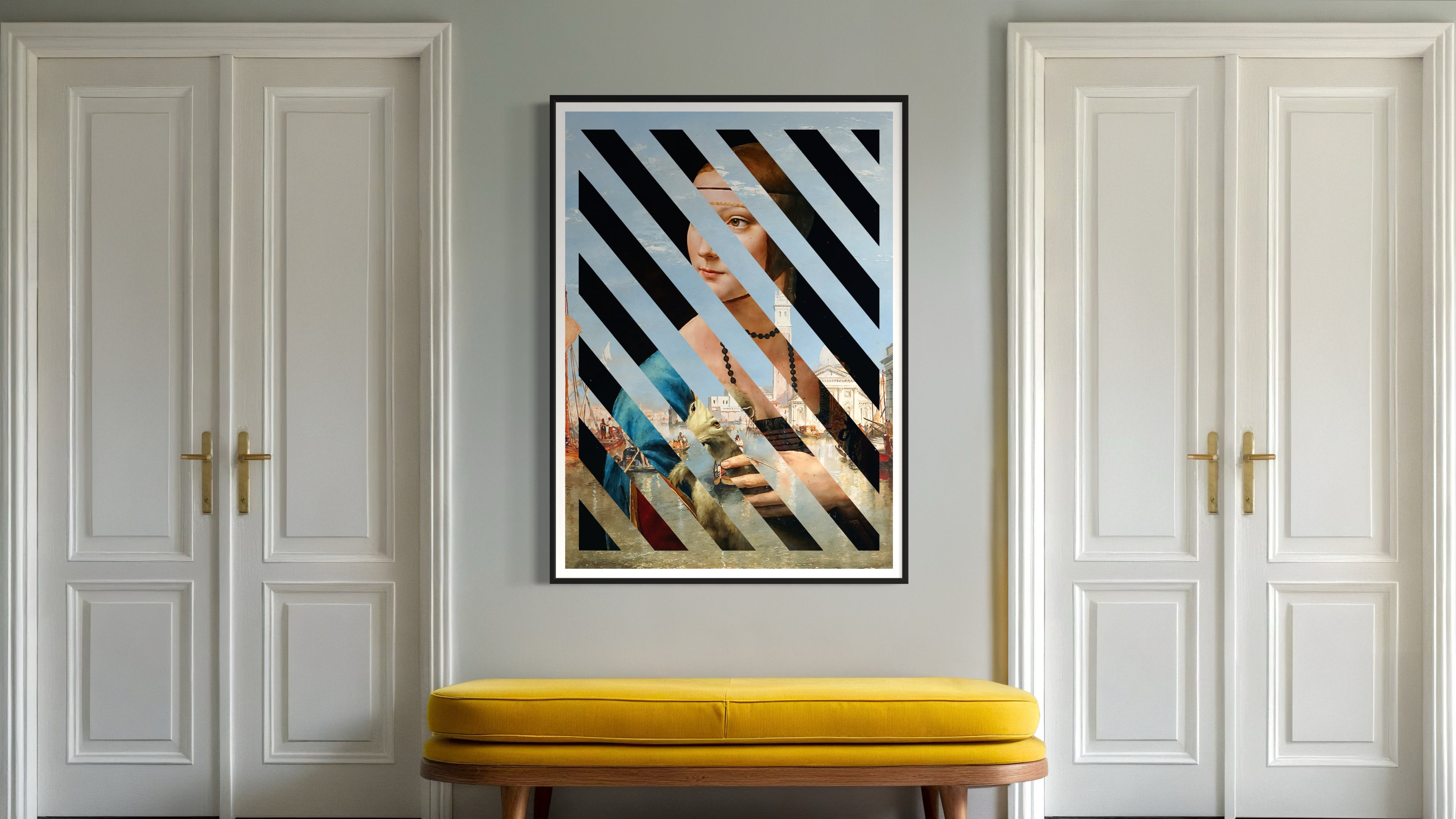 Diagonal slashes cut through the image, fragmenting her presence and merging the precision of Renaissance portraiture with the fluid elegance of Venetian seascapes. The ermine, still nestled in her hands, remains a symbol of status and refinement, yet here it takes on new meaning—representing the movement of history, the way identity shifts across time and place.