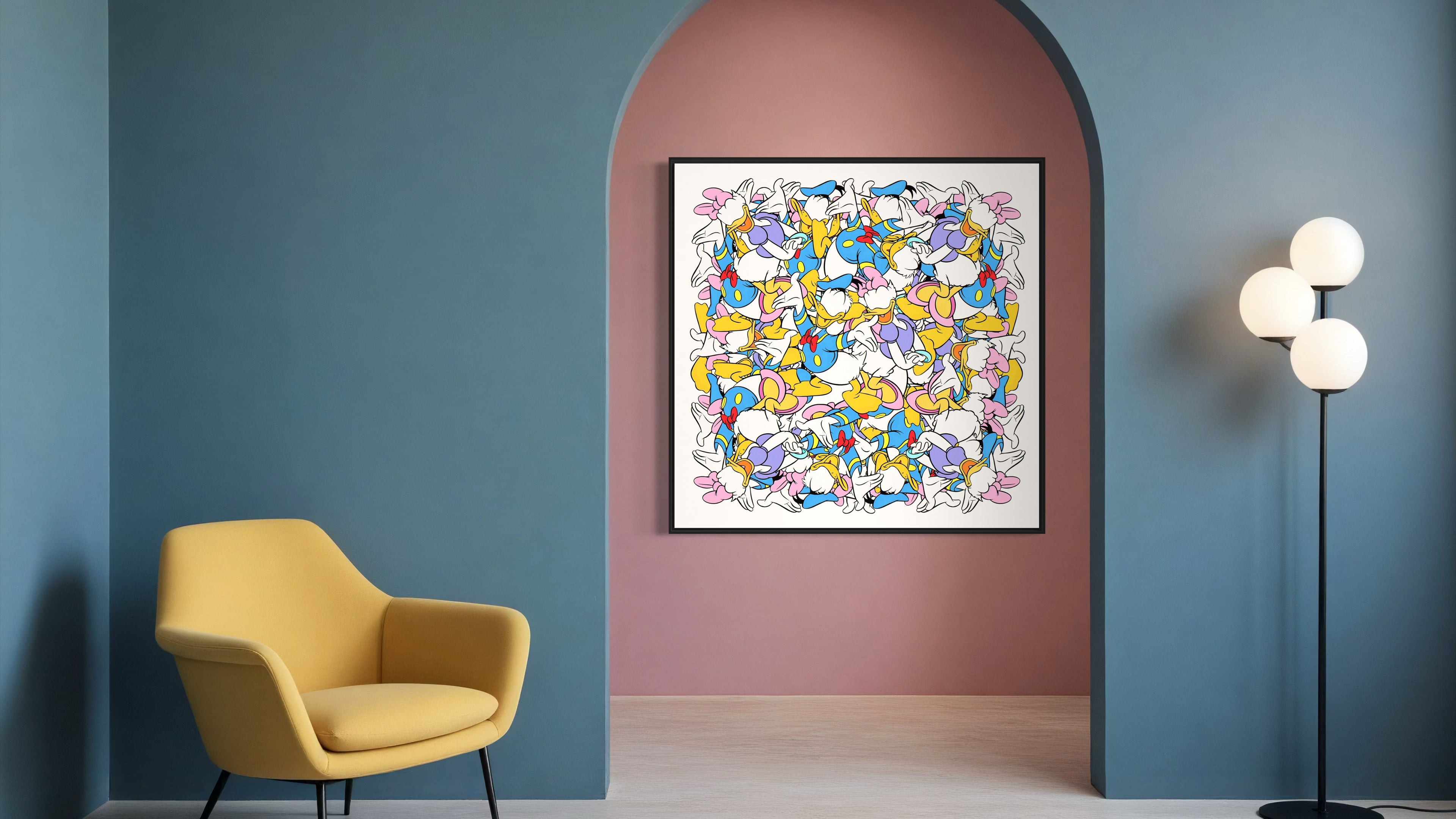 Donald Duck and Daisy Duck collide in a colorful, chaotic arrangement of overlapping forms. The vibrant pastel palette highlights the playful, quirky nature of these beloved characters while offering a fresh and contemporary take on their enduring charm.