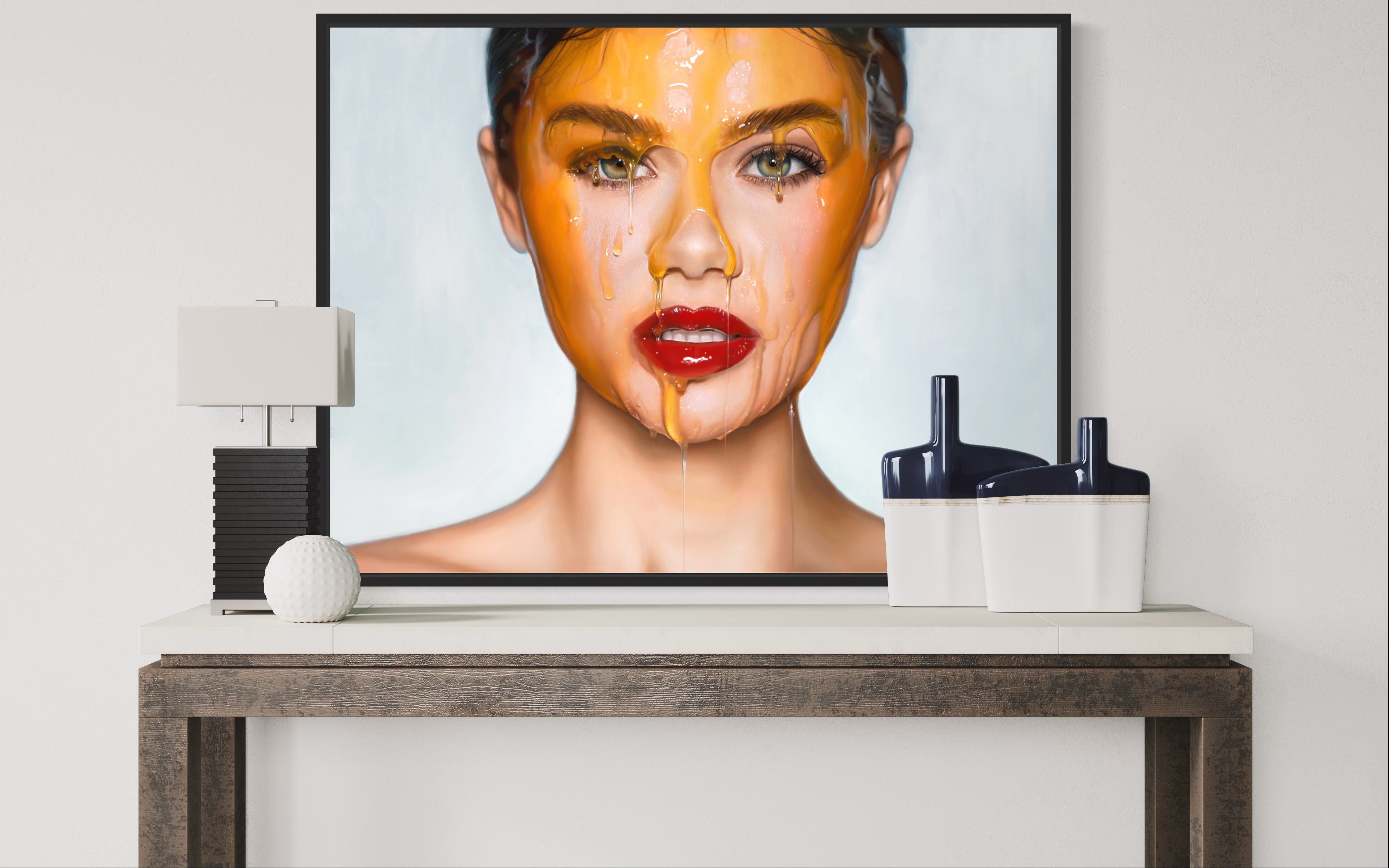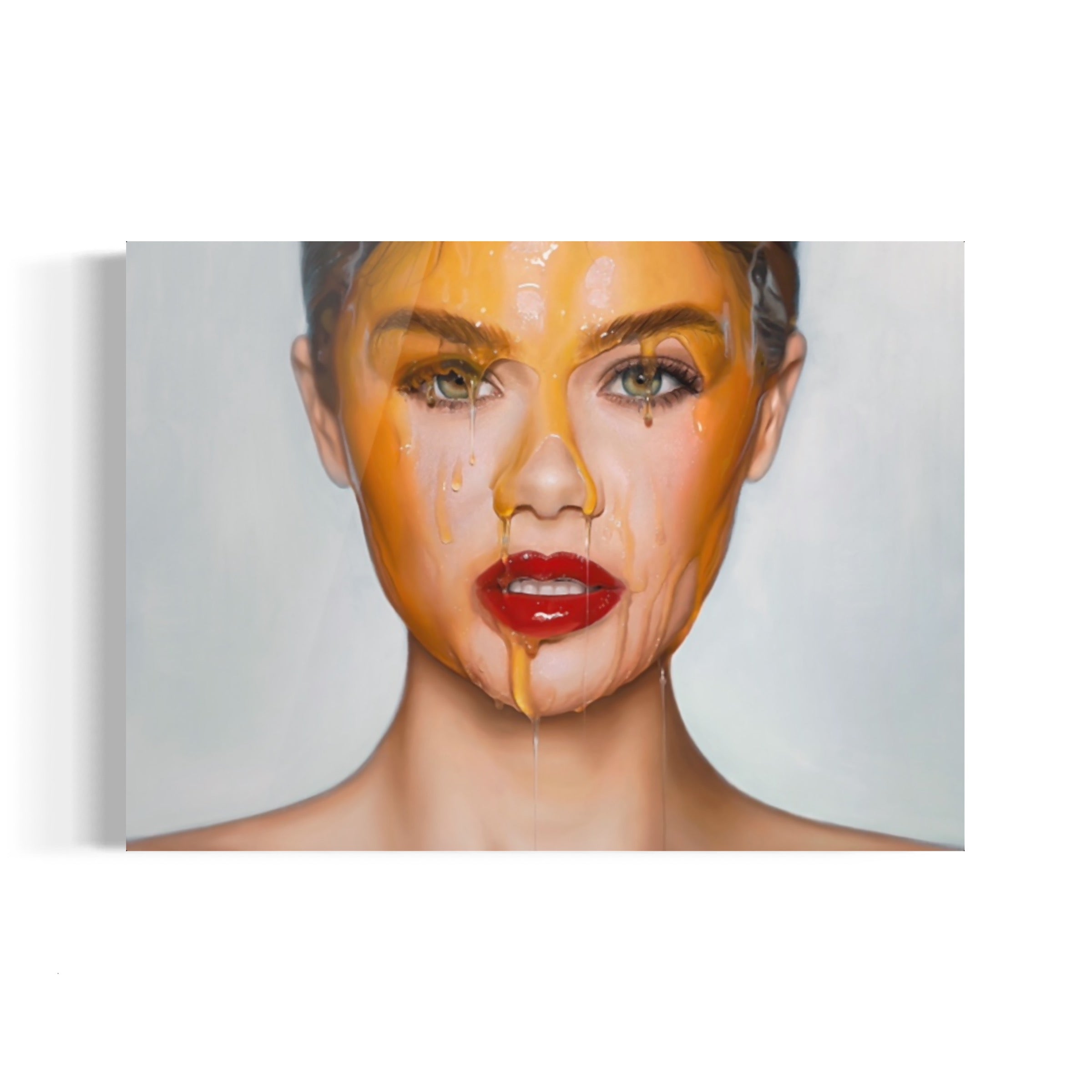 Prepare to be captivated by The Creative Directive's "Honeyed Gaze." This remarkable piece features a captivating model, her wide-eyed gaze made all the more enchanting by the golden trails of honey flowing over her face. The honey adds a layer of intrigue to her intense stare, inviting viewers to engage with her mesmerizing expression. It is a testament to the beauty of human emotion, captured under the rich, honeyed lens of the artist. Immerse yourself in the allure of "Honeyed Gaze" and experience the captivating beauty of this artwork in your space. Shop now and let the honeyed gaze of this masterpiece captivate your heart and soul.