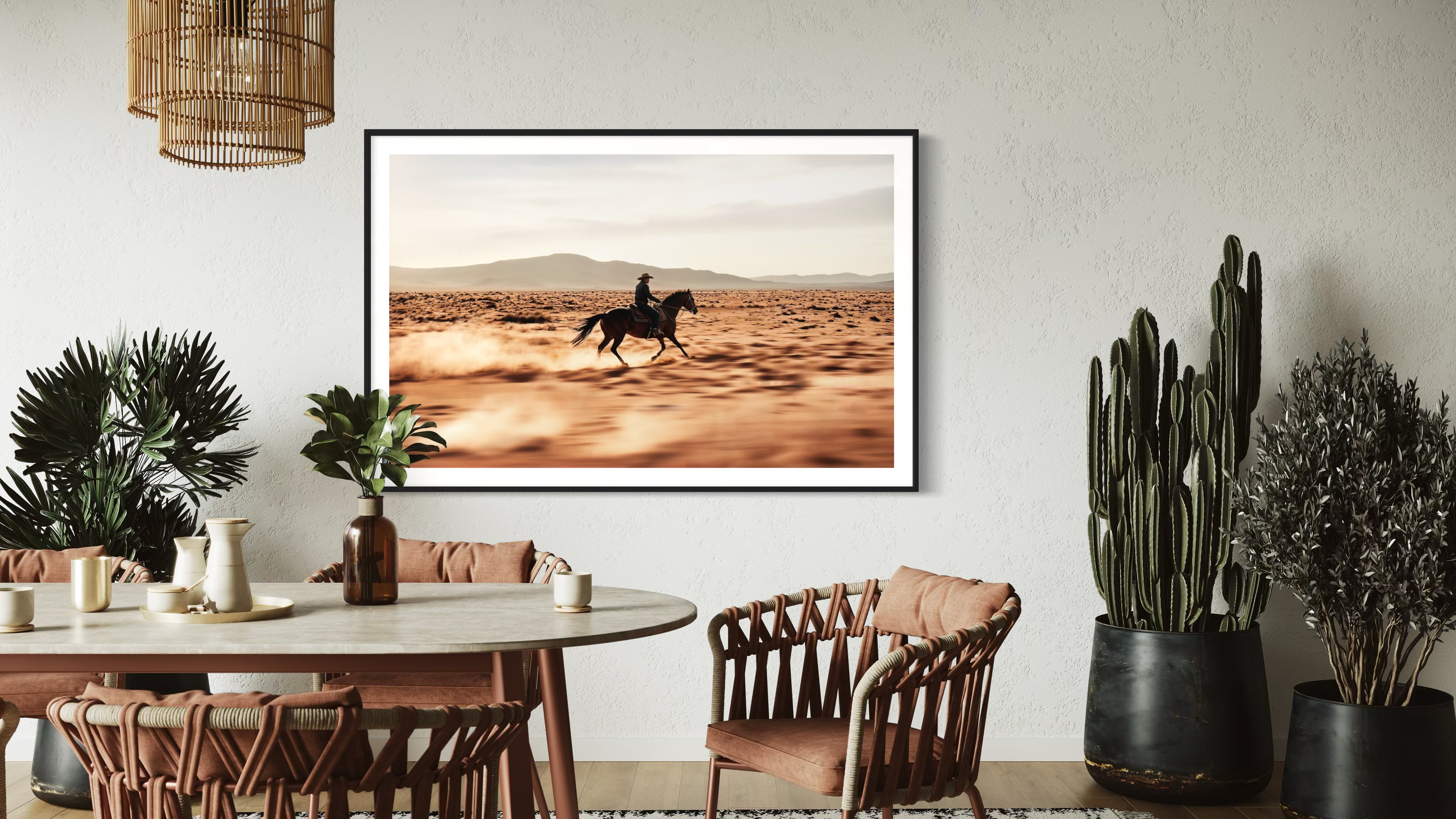 The swirling dust, caught in the motion of hooves pounding against the earth, speaks to the raw power and unbridled spirit of the ride. There is a cinematic quality to this moment, an image that could belong to the past as much as the present. It is a reflection of resilience, a tribute to those who have long roamed the frontier, chasing a dream, a destiny, or simply the next stretch of open land.