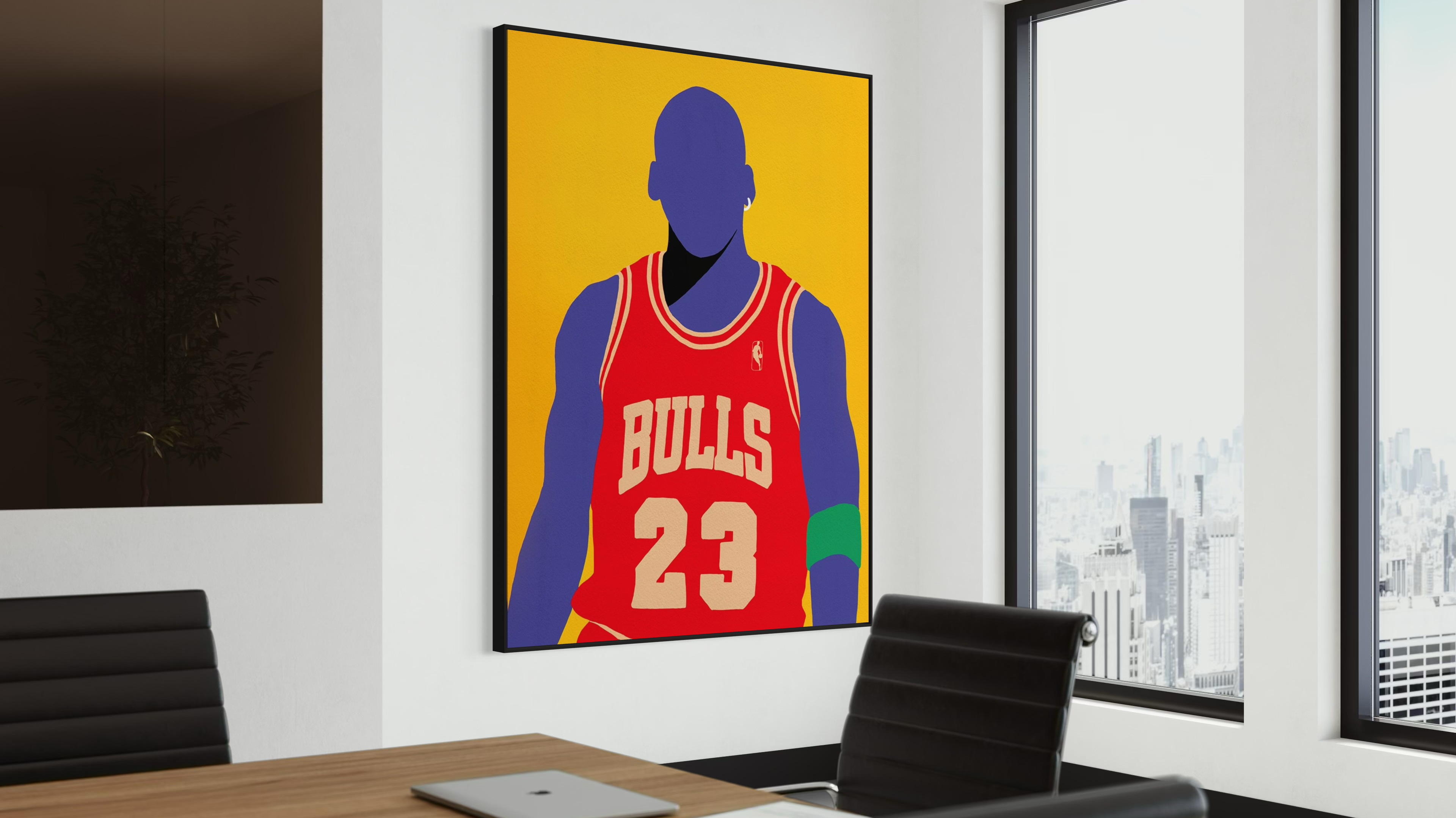 Jordan’s legendary status is immortalized in this minimalist composition, where his most recognizable attributes evoke memories of his high-flying dunks and championship victories. By omitting facial features, the painting invites viewers to focus on Jordan’s influence—his “Jumpman” persona that transcends the game, inspiring generations of athletes and fans alike.