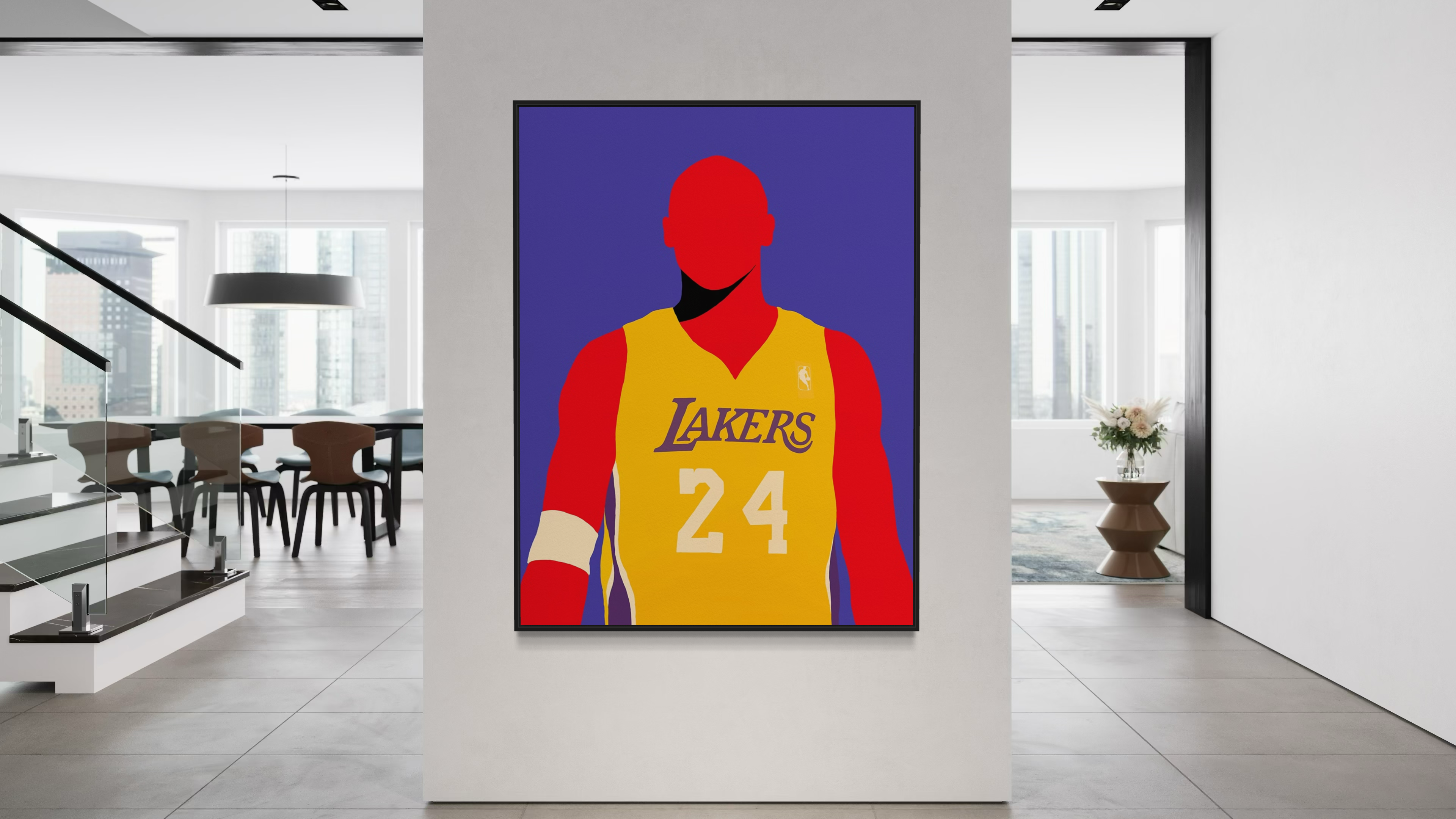 In “Mamba Legacy,” The Creative Directive presents an iconic portrayal of basketball legend Kobe Bryant, rendered in vibrant hues of Lakers gold and purple. The faceless subject, instantly recognizable by his signature No. 24 jersey, stands as a tribute to Bryant’s unparalleled legacy. The minimalist use of color, combined with the absence of facial features, allows the viewer to focus on the figure’s powerful presence, symbolizing the lasting impact Bryant had on the game and beyond.