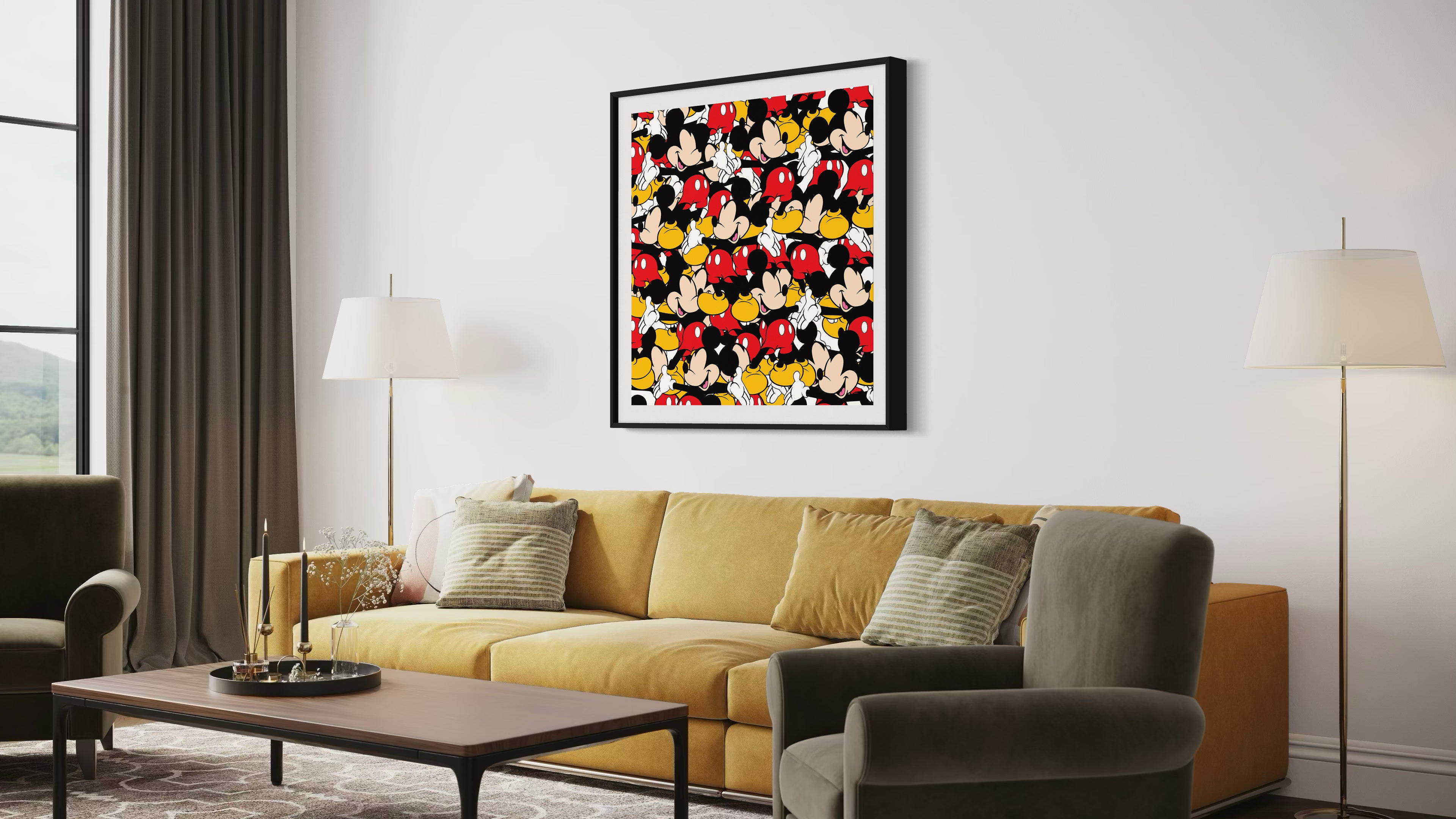 A bold reimagining of an icon, Mickey Mosaic transforms nostalgia into a vibrant, rhythmic collage of color and form. Classic hues of red, black, yellow, and white collide in a layered symphony, where each fragment contributes to the larger whole. The repetition of familiar features—gloved hands, round ears, expressive grins—creates an optical frenzy, blurring the line between order and chaos.