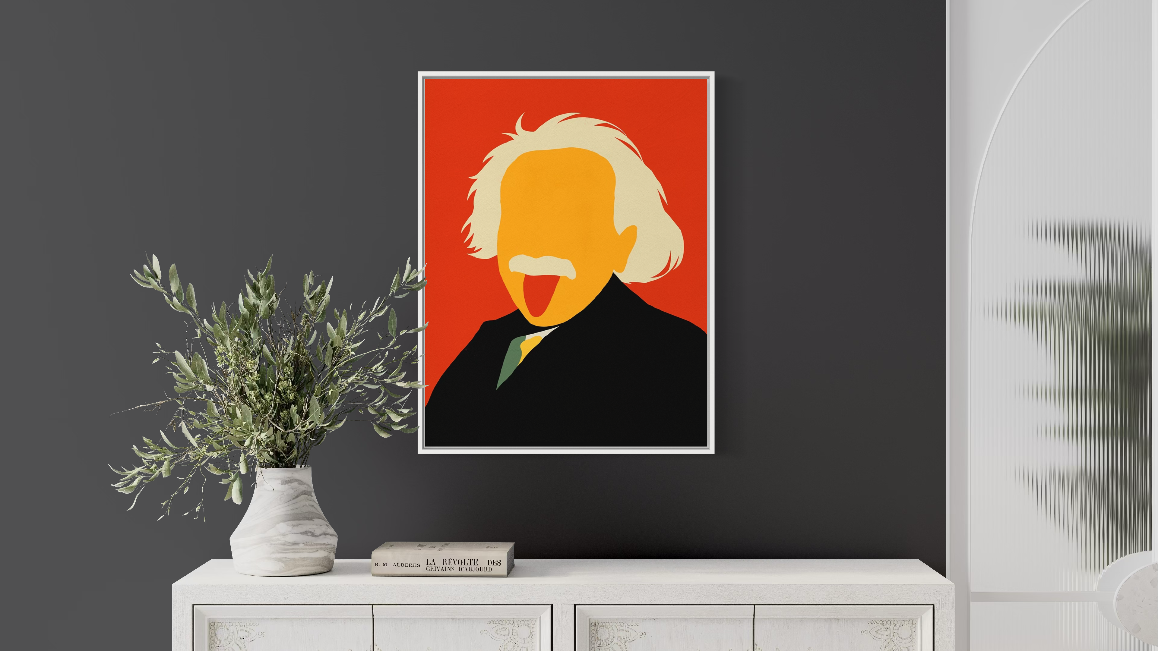 This piece captures not just Einstein’s intellectual contributions to the world, but also his ability to approach life with a sense of curiosity and lightheartedness. The vibrant contrast between the colors emphasizes his duality—both as a serious scientific mind and a cultural icon known for his playful attitude.