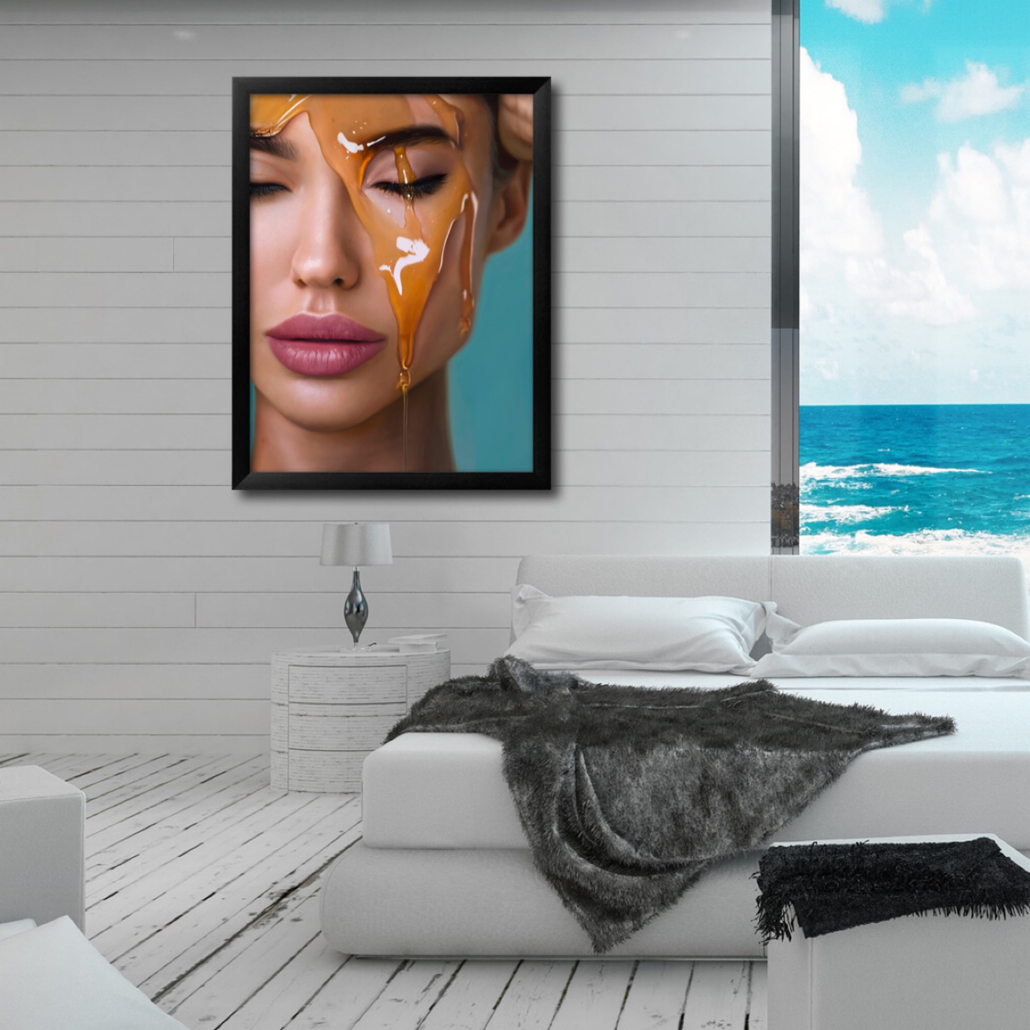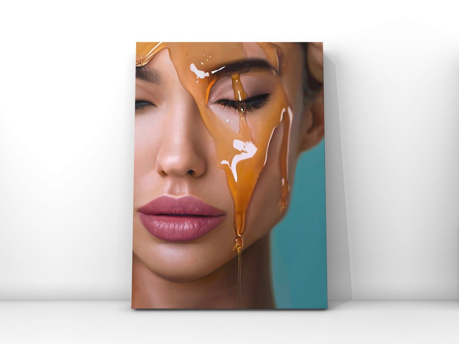 Indulge in the serene tranquility of "Blue Bliss" by The Creative Directive. This exquisite piece showcases an elegantly posed model against a beautifully rich blue backdrop. The portrait's composition exudes a unique charm, with the model's upper forehead and closed eye gracefully cut off by the canvas's top left corner. As golden honey flows over her closed eyes, the serene blue background creates an aura of blissful tranquility. "Blue Bliss" captures a moment of serene repose, beautifully bathed in the contrasting colors of golden honey and sapphire blue. Immerse yourself in the captivating beauty of this artwork and let it create a haven of tranquility in your space. Shop now and experience the blissful harmony of "Blue Bliss" in your collection.