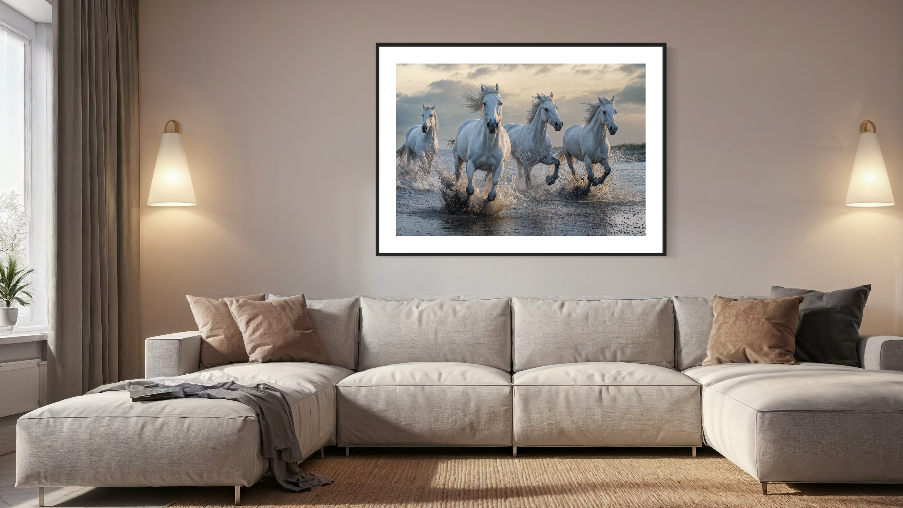 “Thundering Tides,” captures the raw power and grace of a herd of white horses as they charge through shallow waters, creating a mesmerizing display of nature in motion. The cool tones of the early dawn sky contrast beautifully with the light-colored coats of the horses, while the splashes of water beneath their hooves add a dynamic sense of energy and movement. The scene evokes both freedom and strength, as the horses run together in perfect harmony with their surroundings.