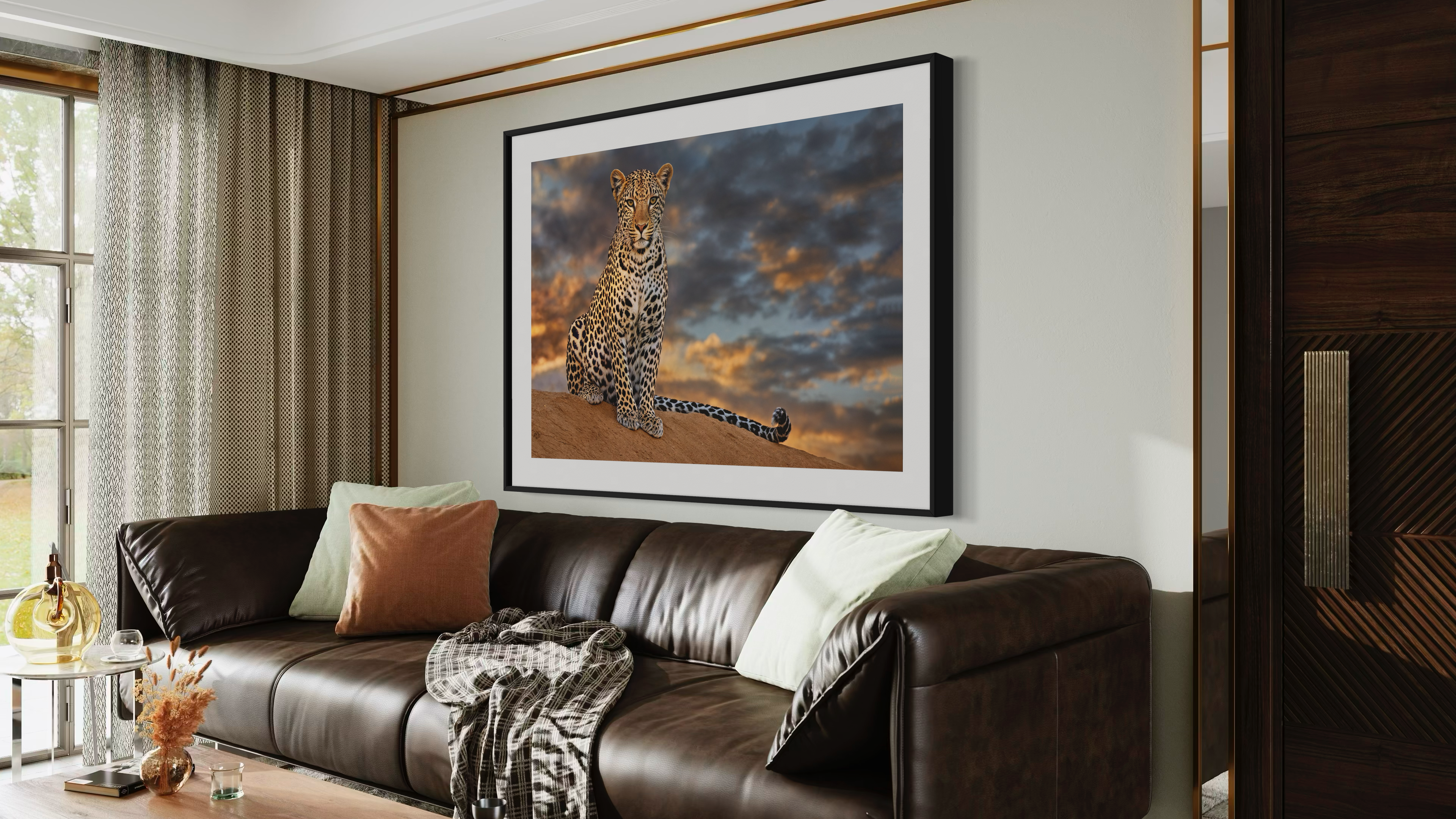 The Creative Directive draws on the iconic style of wildlife photography, blending natural beauty with technical mastery. The vibrant colors of the sky, from warm yellows to deep blues, complement the leopard’s sleek form, turning this photograph into a visual masterpiece. Every spot on its fur stands out, further highlighting the wild, untamed nature of this apex predator.