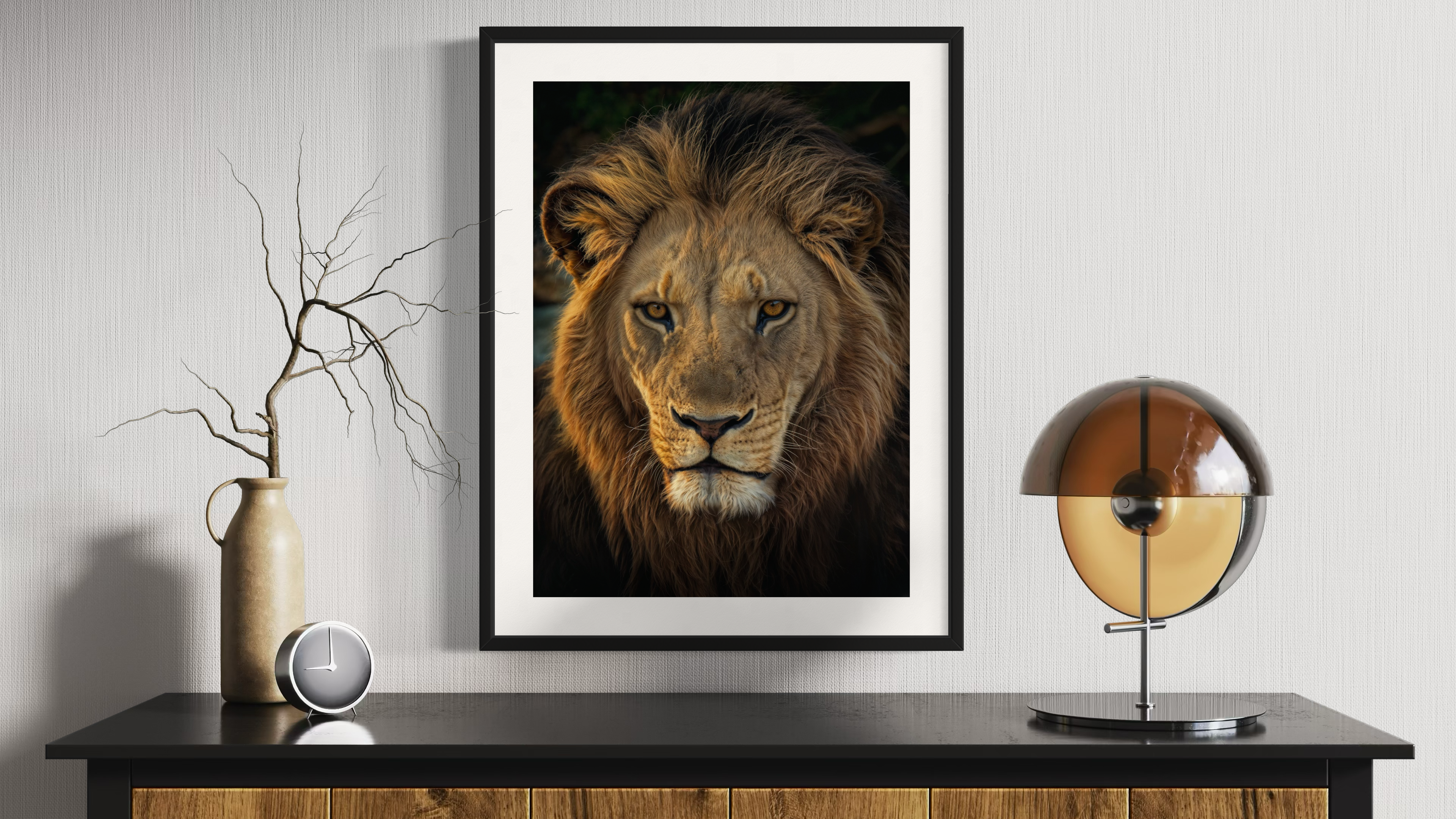 The Creative Directive has drawn inspiration from iconic wildlife photography, blending technical skill with artistic expression. The lion’s focused eyes and slightly furrowed brow convey a deep intensity, as if it is staring into the soul of the viewer. The rich texture of its mane, highlighted by the interplay of light and shadow, adds dimension and depth to the image, making the lion feel larger than life.